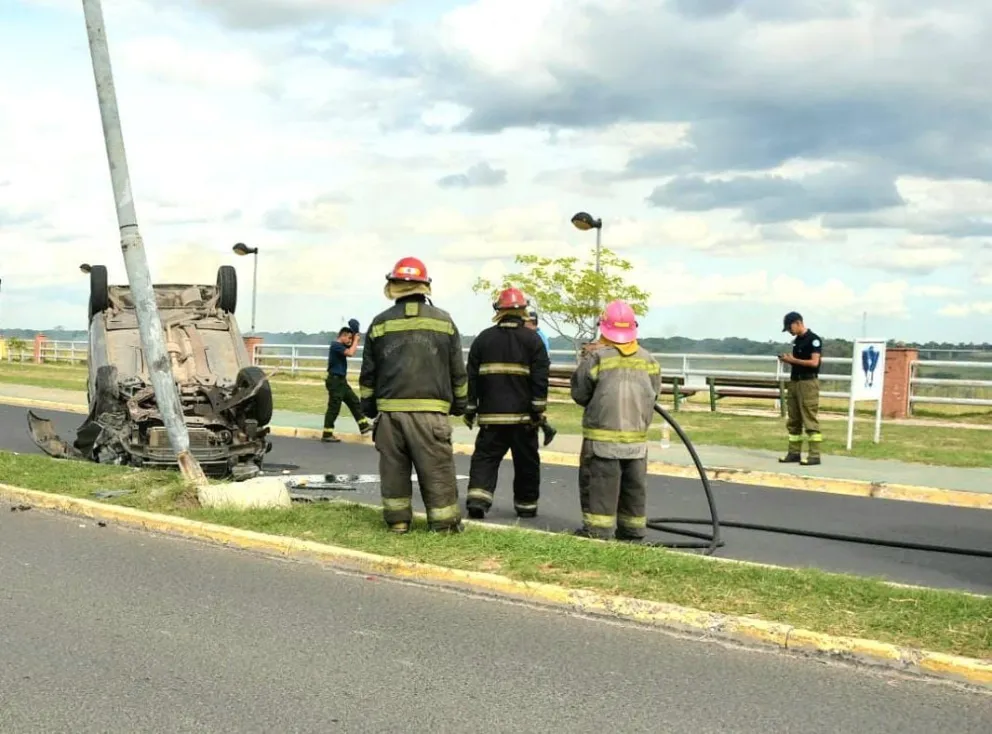 ACCIDENTE VIAL Conductor chocó un poste de alumbrado público y terminó volcando en la Avenida Ribereña