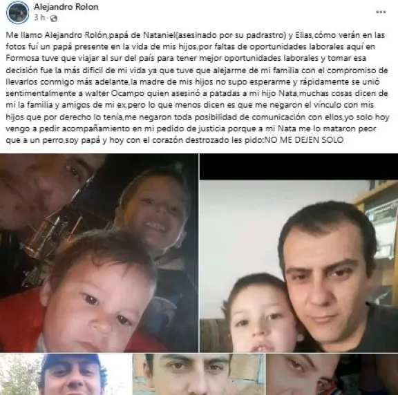 "Muchas cosas dicen de mí la familia y amigos de mi ex, pero lo que menos dicen es que me negaron el vínculo con mis hijos", se lamenta. "A mi Nata me lo mataron peor que a un perro", dijo con profundo dolor. "Soy papá y hoy, con el corazón destrozado, les pido: No me dejen solo". Un grito desesperado que resuena en la búsqueda de justicia para Nataniel que acompaña toda la provincia de Formosa.