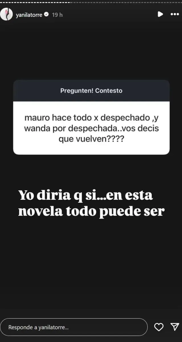 Una usuaria le preguntó si veía probabilidades de que Wanda y Mauro se reconciliaran, a lo que Yanina respondió de manera contundente: “Yo diría que sí. En esta novela, todo puede pasar”. Con su característico tono, la panelista dejó abierta la posibilidad de que, a pesar de los conflictos previos, la expareja pueda encontrar el camino hacia una nueva oportunidad juntos.