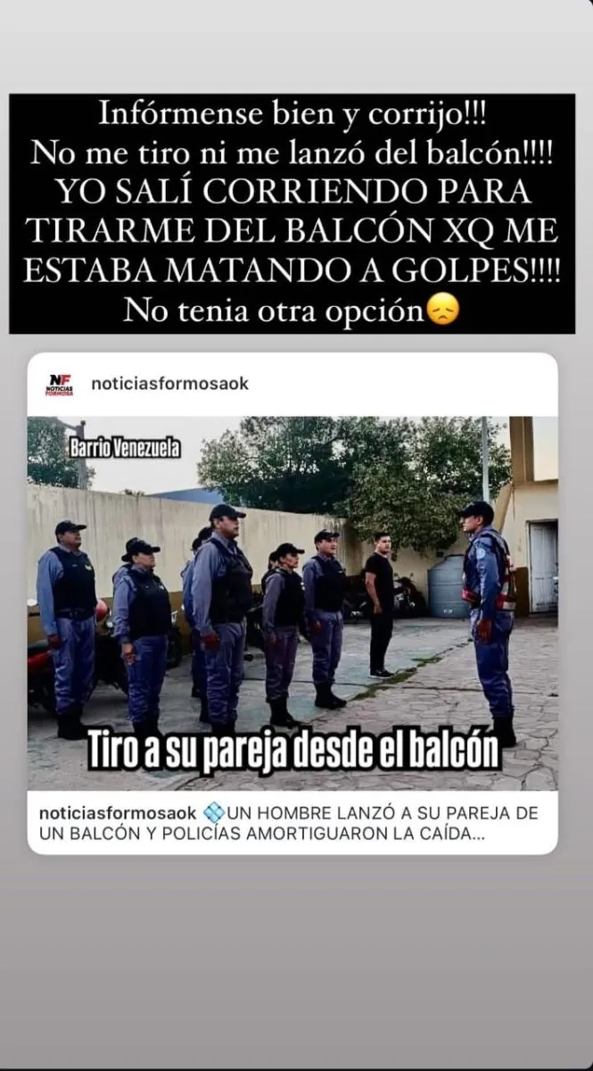 "No me tiro ni me lanzó del balcón. ¡YO SALÍ CORRIENDO PARA TIRARME DEL BALCÓN PORQUE ME ESTABA MATANDO A GOLPES! No tenía otra opción", escribió en sus redes sociales. Este desesperado acto de autoprotección pone en evidencia la brutal situación de violencia de género a la que estaba sometida.