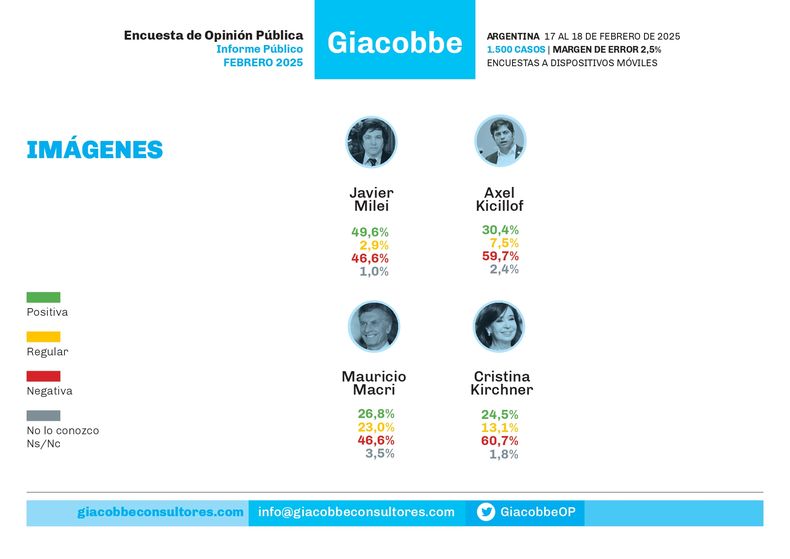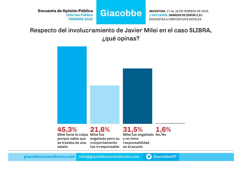 La promoción de la criptoestafa $LIBRA le costó al presidente Javier Milei un salto de 10,4 puntos porcentuales en su imagen "negativa" de enero a febrero, según la última encuesta de Giacobbe. Sin embargo su imagen "positiva" apenas cayó de 50,1% a 49,6%.