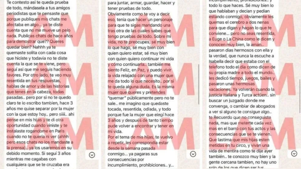 En relación con el tema de sus hijas, Mauro continuó con su reproche: “Les correspondía estar conmigo la semana pasada y vas a pagar las consecuencias por incumplir. Les lavas el cerebro para que hagan lo que te conviene. A Euge, o ‘La China’ como le dicen, la adoran y pasaron días maravillosos con ella. Ya volverán cuando la justicia italiana y turca actúe. Qué lástima que mis hijas estén en tu circo, viviendo una vida falsa”.