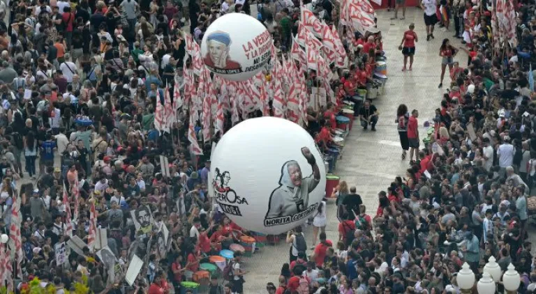 Lo otro que dice el globo que sobrevuela la marcha es que esta multitud está acá porque le exige respuestas al Estado. Que el paradero de los desaparecidos sigue en estado de pregunta y que esa es una deuda con sus familiares, con sus amigos, con sus compañeros de trabajo y con la sociedad argentina.