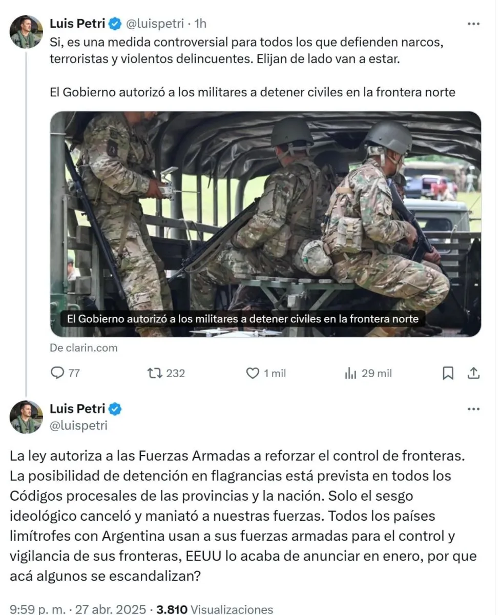 El ministro defendió la aplicación del cambio en materia de seguridad nacional al argumentar que la posibilidad de cursar "detenciones en flagrancias" está prevista en todos los códigos procesales provinciales y en el nacional. "Solo el sesgo ideológico canceló y maniató a nuestras fuerzas", se jactó Petri en y remató: "Todos los países limítrofes con Argentina usan a sus fuerzas armadas para el control y vigilancia de sus fronteras, EEUU lo acaba de anunciar en enero, ¿porqué acá algunos se escandalizan?". En qué consiste la nueva Operación "Julio Argentina Roca".