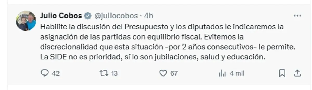 También por la red social X le respondió el radical Julio Cobos, quien señaló que “habiliten la discusión del Presupuesto y los diputados le indicaremos la asignación de las partidas con equilibrio fiscal. Evitemos la discrecionalidad que esta situación -por 2 años consecutivos- le permite. La SIDE no es prioridad, sí lo son jubilaciones, salud y educación”.