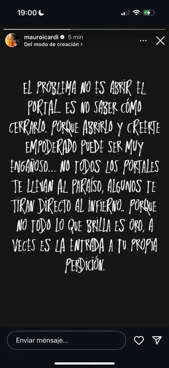 A través de sus historias de Instagram, Icardi publicó una reflexión con tintes filosóficos y oscuros. “El problema no es abrir el portal, es no saber cómo cerrarlo. Porque abrirlo y creerte empoderado puede ser muy engañoso”, escribió, dejando a sus seguidores preguntándose si el texto era una alusión a las recientes declaraciones de su pareja o una indirecta para Vicuña.