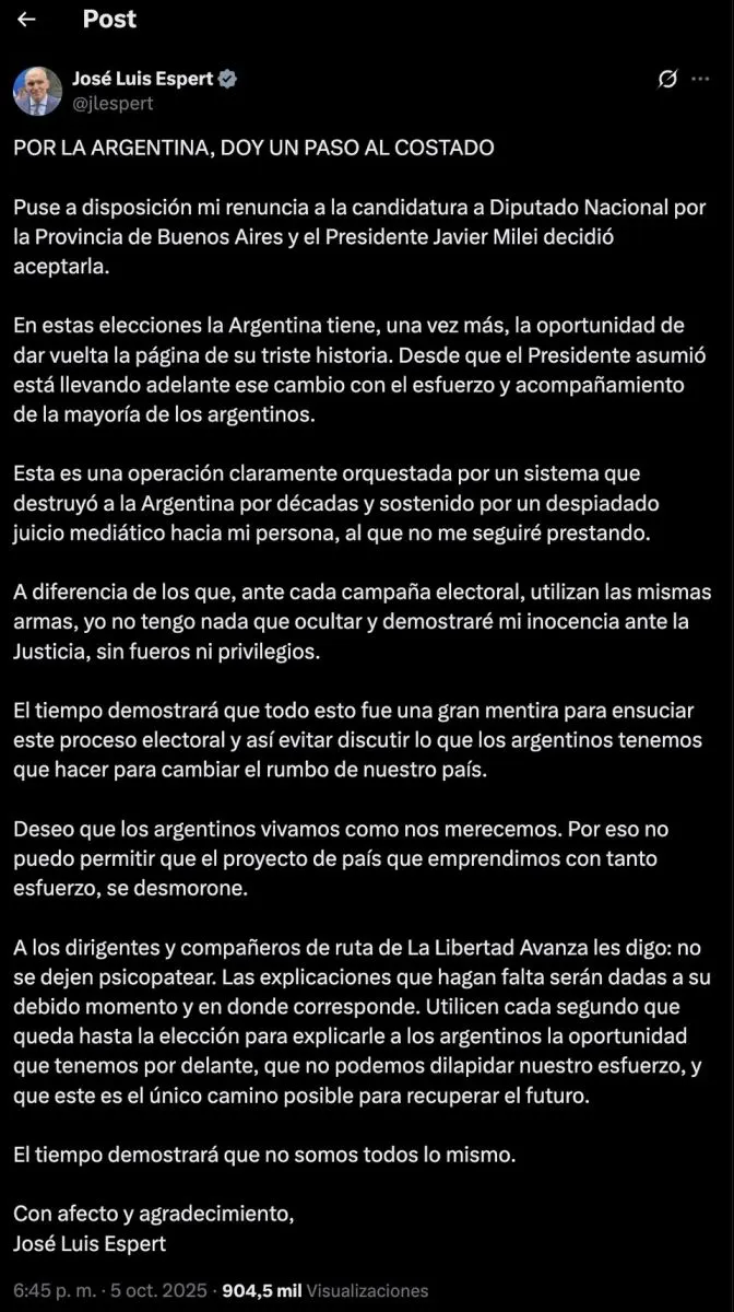 A través de una publicación en la red social X, el referente de La Libertad Avanza anunció que había puesto “a disposición” su renuncia y que el presidente Javier Milei la aceptó, luego de una semana marcada por revelaciones, presiones internas y un creciente malestar dentro del oficialismo.