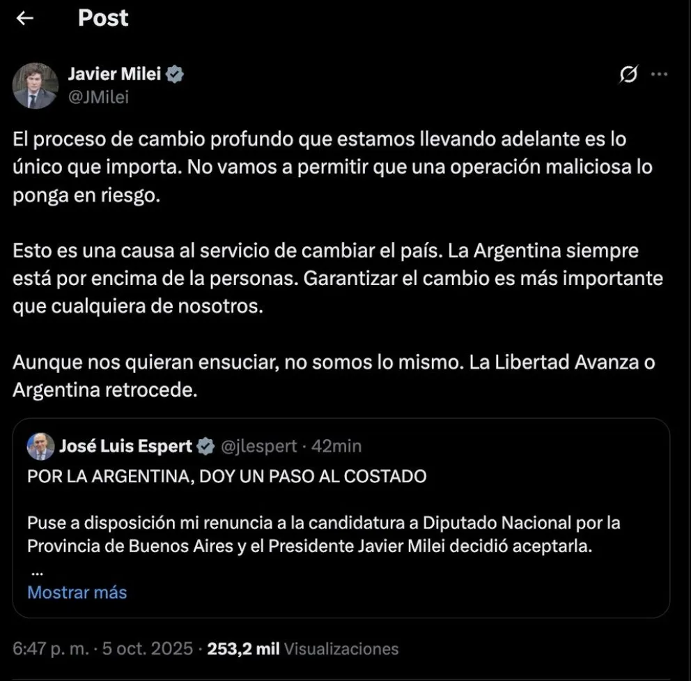 En su mensaje difundido en redes, Espert aseguró que su decisión responde a un intento de “no perjudicar el proyecto de país” impulsado por el presidente Milei.