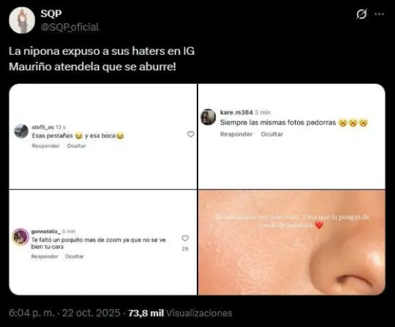 Entre los mensajes que comenzaron a aparecer, algunas usuarias le escribieron frases cargadas de sarcasmo y desprecio. “Siempre las mismas fotos pedorras”, lanzó una. Otra apuntó: “Esas pestañas y esa boca”. Una tercera directamente comentó: “Vómito”. Y una más ironizó: “Te faltó un poquito más de zoom ya que no se ve bien tu cara”.