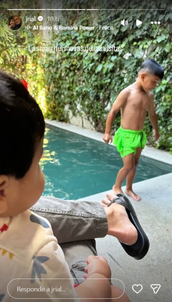 "La más hermosa de las visitas”, escribió el conductor en una historia de Instagram donde se lo ve con Amadeo, el bebé de un año, en brazos, mientras Francesco disfruta de la pileta. La postal refleja un clima de calma y ternura en medio del vendaval emocional que atraviesa la familia.