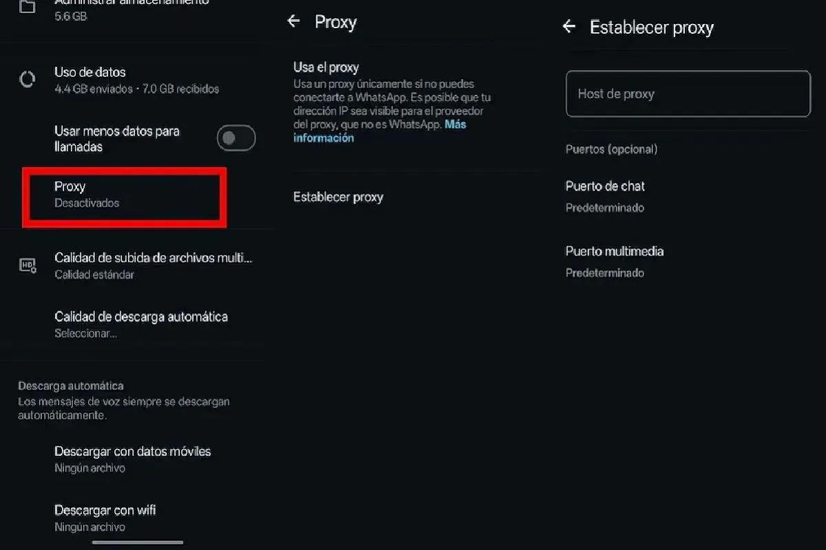 Conectar WhatsApp a un proxy es sencillo y varía ligeramente según el sistema operativo. En Android, hay que ingresar a “Chats”, luego a “Ajustes”, seleccionar “Almacenamiento y datos” y finalmente “Proxy”. Allí se activa la opción, se introduce la dirección del servidor y se guarda la configuración hasta ver la palomita verde.