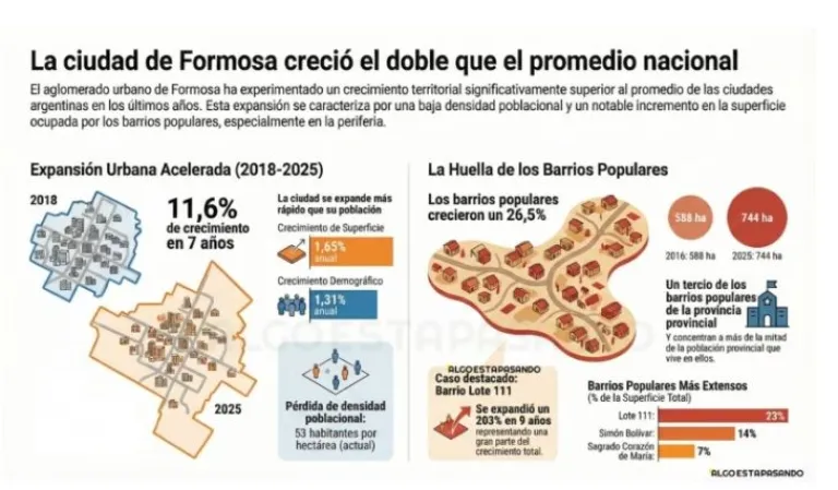 La capital formoseña experimentó un crecimiento del 11,6% en su mancha urbana entre 2018 y 2025, más del doble que el promedio del país. El fenómeno se da en paralelo a una preocupante pérdida de densidad poblacional y con el 83% de los hogares enfrentando problemas habitacionales.