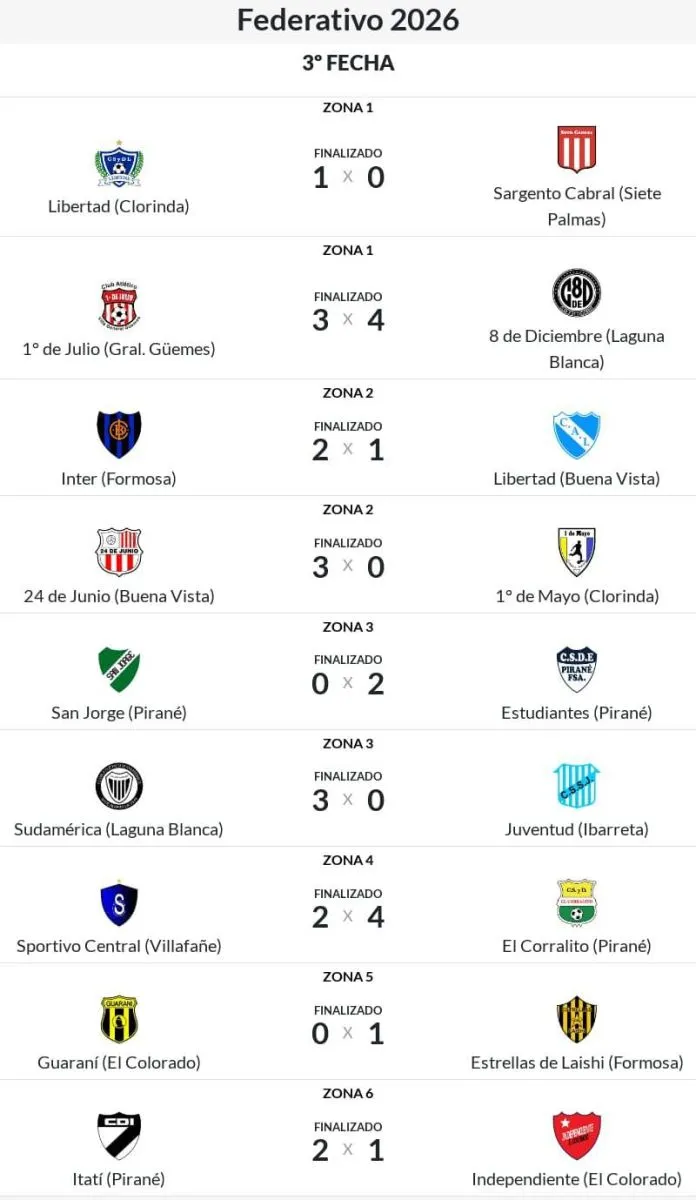 Entre el sábado y domingo se jugaron la totalidad de los partidos válidos por la tercera fecha del Torneo Federativo de Clubes. El certamen organizado por la Federación Formoseña de Fútbol (FFF), otorgará al campeón el boleto para jugar el próximo Torneo Regional Amateur del Consejo Federal de la AFA. A continuación, los resultados de las seis zonas.