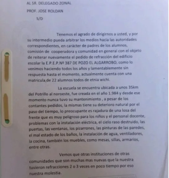 Según consta en la denuncia de la comunidad, el pasado 26 de febrero presentaron una nota formal dirigida al delegado zonal, el profesor José Roldán, detallando los pormenores del abandono estructural. Sin embargo, al día de hoy, el silencio institucional es total.