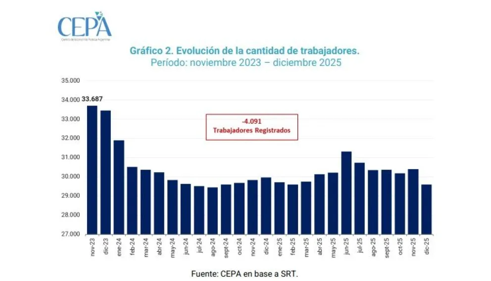 También se redujo la cantidad de trabajadores registrados, que bajó de 33.687 a 29.596, lo que implica una pérdida de 4.091 puestos de trabajo y una contracción del 12,1%