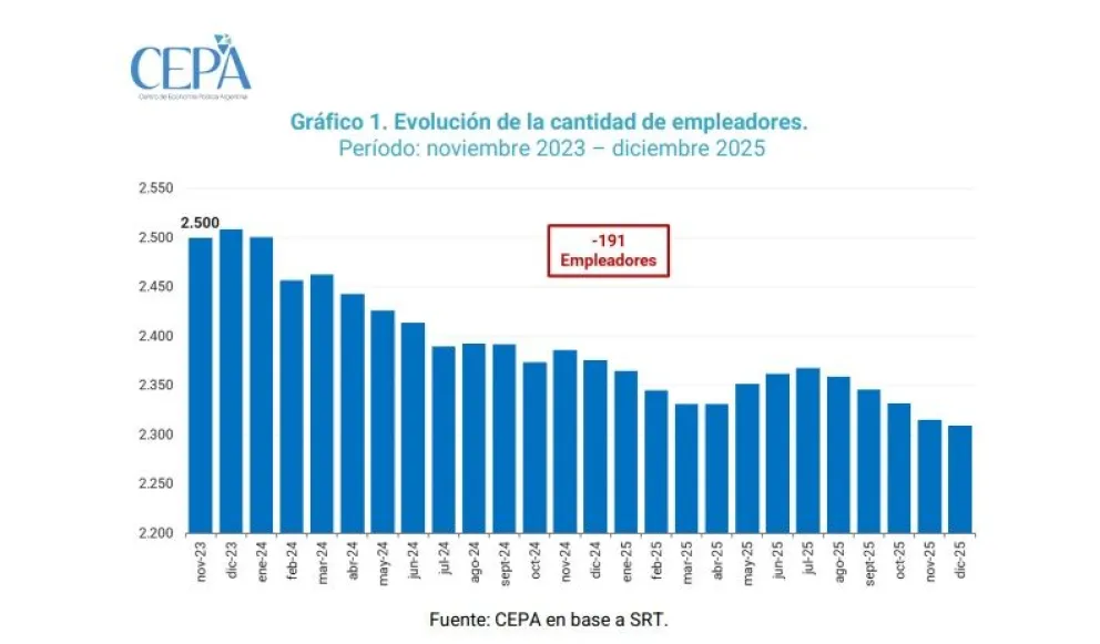 Un informe del Centro de Economía Política Argentina (CEPA), elaborado en base a datos de la Superintendencia de Riesgos del Trabajo (SRT), registró un retroceso en los principales indicadores del empleo formal en Formosa entre noviembre de 2023 y diciembre de 2025. En ese período, la provincia pasó de 2.500 a 2.309 empleadores con personal registrado. Esto implica una contracción de 191 empleadores, reflejando una tendencia negativa en el tejido empresarial durante el período.