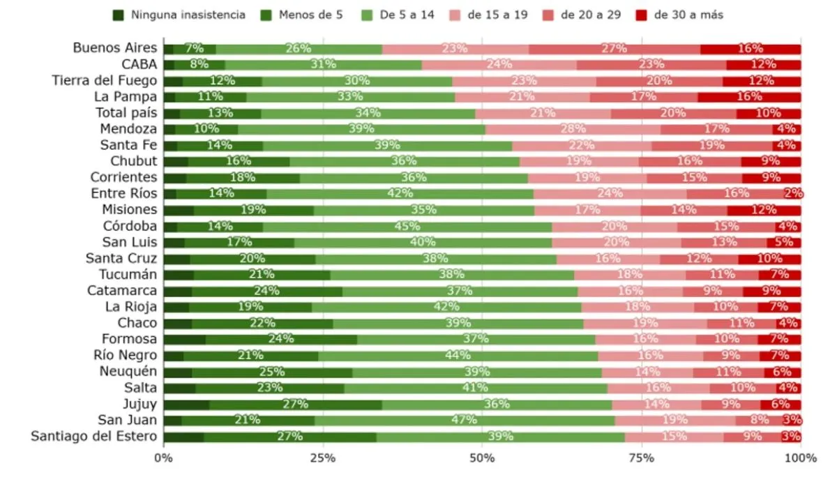 Buenos Aires encabeza el ranking con un 66% de estudiantes que acumulan al menos 15 faltas, seguida por la Ciudad de Buenos Aires (59%), Tierra del Fuego (55%) y La Pampa (54%). En el otro extremo, Santiago del Estero (28%), San Juan (29%) y Jujuy (30%) presentan niveles más bajos de ausentismo, según lo informado por los estudiantes. ​