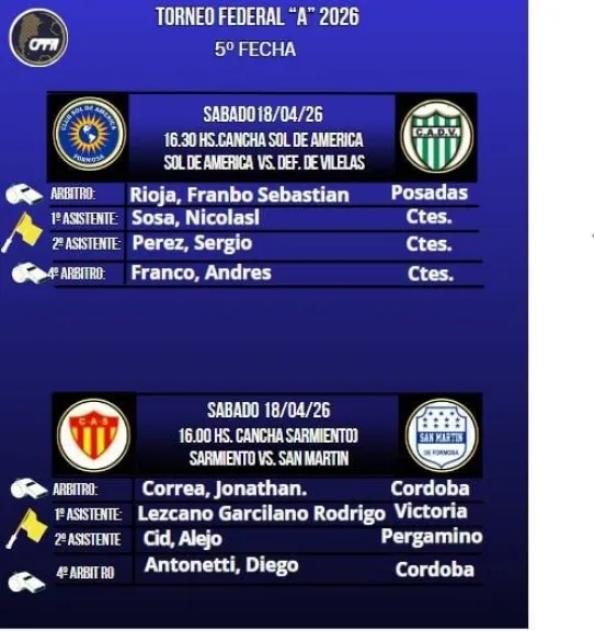 Los equipos formoseños jugarán sus compromisos de la quinta fecha de la Zona 2 del Torneo Federal “A” 2026 en la jornada del sábado 18. Sol de América recibirá a Defensores de Vilelas (Chaco) en el estadio del Lote 34, en tanto que San Martín visitará a Sarmiento en el estadio Centenario de la ciudad de Resistencia (Chaco). A continuación, todos los detalles: